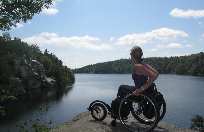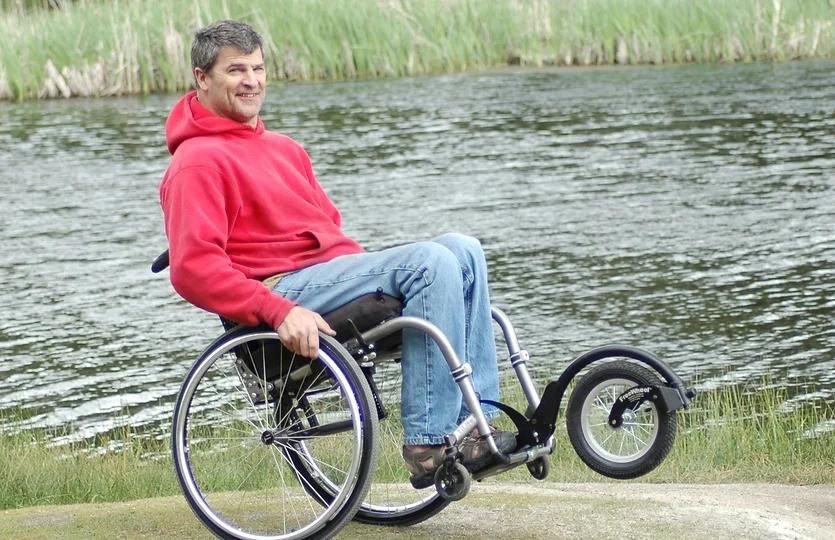 Légère et compacte, la roue FreeWheel s'installe en moins de 10 secondes sur tout fauteuil roulant à repose-pieds fixe (pour les fauteuils pliants, voir l'adaptateur proposé plus bas).