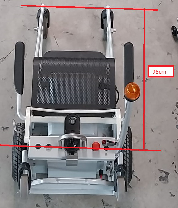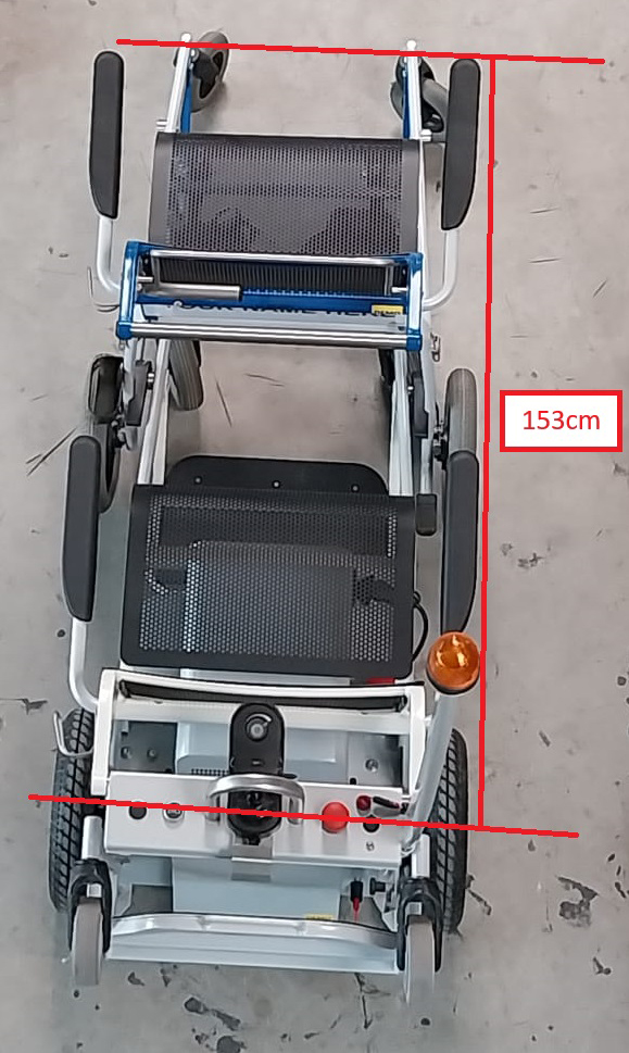 La longueur totale est de 44cm de plus, lorsque la plateforme conducteur est abaissée. Ici sur les images elle est repliée. Pour le stockage ou pour franchir les ascenseurs.